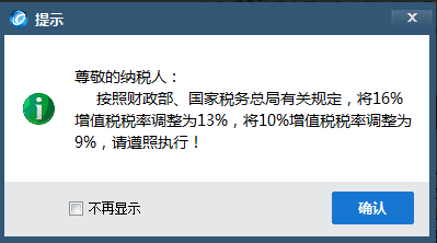 2019年4月1日—3日,进入开票软件,系统提示“按照财务部、国家税务总局有关规定,将16%增值税税率调整为13%,将10%增值税税率调整为9%,请遵照执行!”,勾选“不再显示”,点击“确认”按钮,再次登录开票软件后不再弹出该提示框。
