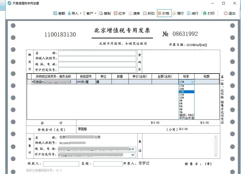 2019年4月1日之后,商品行税率栏增加新增税率。注意,您需要先输入商品名称,才可以选择对应的税率。