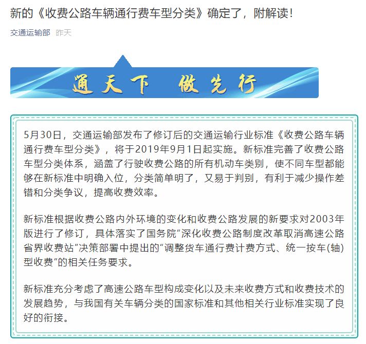 “为解决摩托车的统一分类问题,新标准继承各地区对摩托车分类的主流规定,明确摩托车通行收费公路,按1类客车分类。”