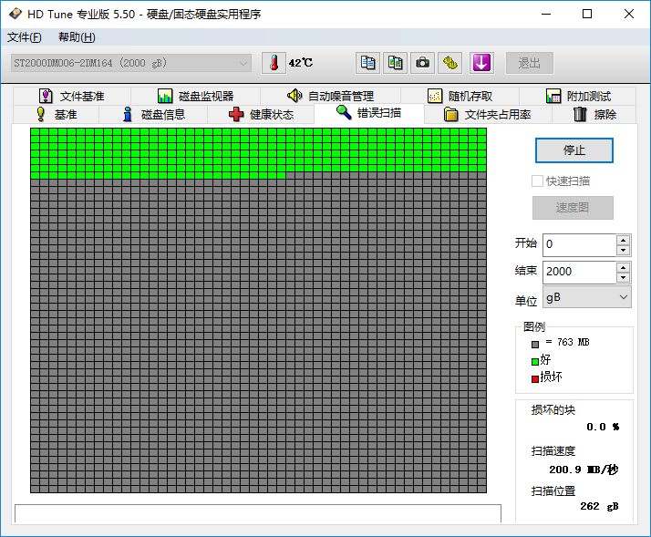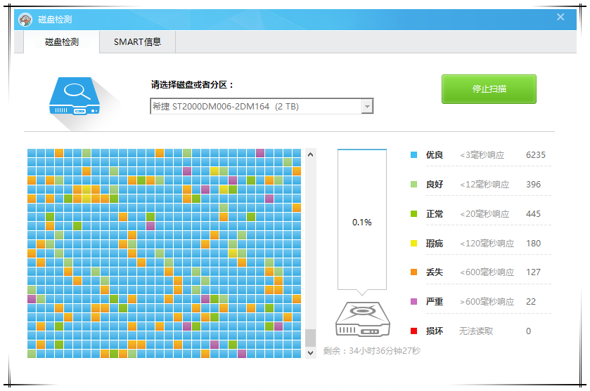 要了解鲁大师硬盘检测的原理,不妨回顾下老牌硬盘检测软件HDTune的错误扫描功能。HDTune的错误扫描图在很多二手硬盘交易过程中被当作有无故障的证明,不过它也只是“错误扫描”,却没有提到体质检测,扫描只有绿色正常和红色故障两种结果,并不能预测硬盘是否接近生命末期。