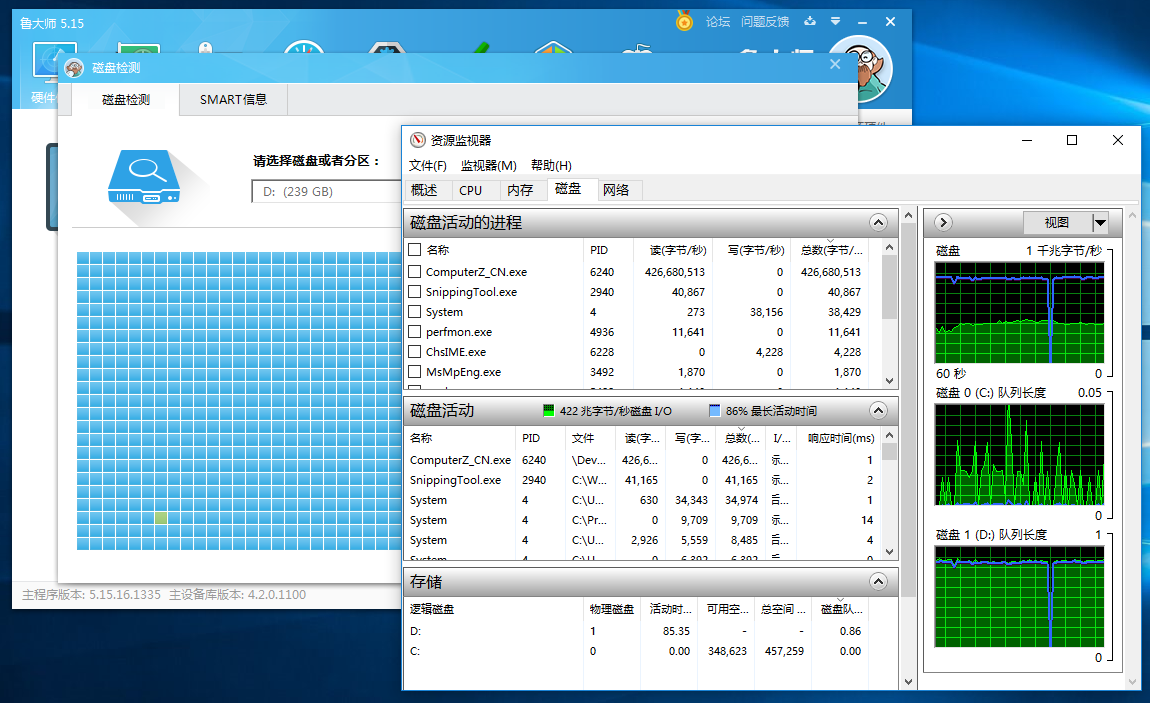 鲁大师到底是如何评判优良、正常和瑕疵的?存储极客在运行鲁大师硬盘检测的同时打开Windows资源监视器,切换到磁盘页面可以看到此时被检测的硬盘正被持续读取,队列深度小于1,说明测试是单线程运行的。