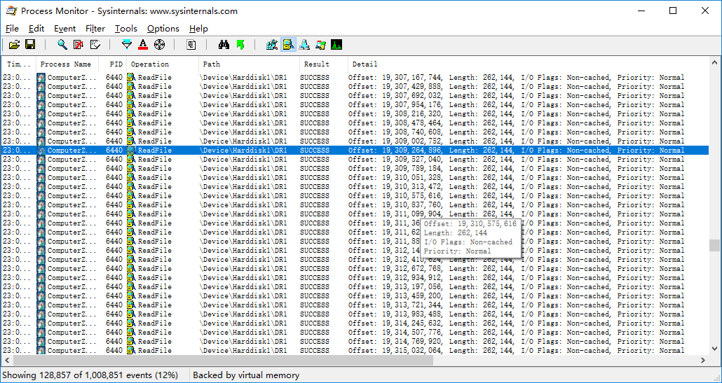 接下来再通过Process Monitor工具可以探测到鲁大师的测试手法,实际就是以256K区块进行连续位置的读取。