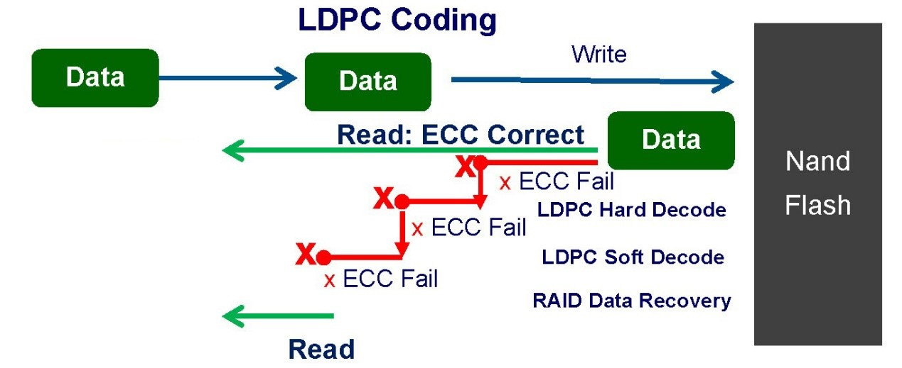 对于电脑中的硬盘也是一样,程序发出读取请求,操作系统将其转换为底层ATA指令,由固态硬盘主控接受指令并执行实际闪存信息读取,经ECC纠错引擎检查通过后原路返回给应用程序。