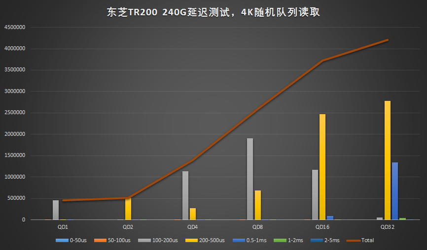 东芝TR200固态硬盘在队列深度在8以内时,读取操作延迟大部处于100-200微秒之间,随着队列深度继续增长,QD=32时负载最大化,延迟以200-500us和2-5ms为主。与之对比的是,7200转台式桌面硬盘在QD≤2时延迟以2-5ms为主,比固态硬盘满载时响应还要迟缓,机械盘在满载QD=32后主流延迟表现达到100-200ms,几乎是固态硬盘的50倍,怪不得从机械硬盘升级到固态后的感受如此的顺滑!
