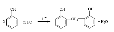 在pH 值为 1.8~2.4 之间的酸性催化条件下,苯酚和甲醛的缩聚反应的速度比加成反应约快 5 倍以上,其反应过程为,苯酚在酸催化剂的作用下其邻、对位易与甲醛发生亲电反应生成羟甲基苯酚,生成的羟甲基苯酚再与苯酚进行缩反应生成二酚基甲烷,反应过程如反应式: