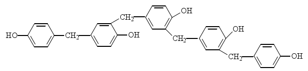 反应过程中生成的二酚基甲烷与甲醛的反应速度和苯酚与甲醛的反应速度一致导致缩聚产物分子链的增长。所得酚醛树脂分子链中酚环约 5 个,数均相对分子质量为 500 左右。其理想化的热塑性酚醛树脂结构如下所示:
