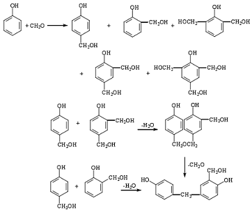 倍,这个过程会持续到约一半的原料甲醛反应消耗完成。当反应温度高于60℃时,反应体系中单羟甲基苯酚、双羟甲基苯酚、三羟甲基苯酚、游离酚和甲醛之间会发生缩聚反应且反应较复杂。与此同时反应体系会有加成反应和缩聚反应共同发生。在反应体系中存在的一元或多元酚醇和二聚体等一直不间断的进行缩聚反应导致树脂相对分子量不断增大,不控制该反应的发生情况则会导致树脂凝胶。反应过程如图: