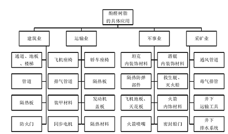 正是由于其具有耐高温、耐冲击、耐化学性、低烟低毒低成本的特点使得酚醛树脂快速发展,现在已经可与热塑性塑料相竞争,如酚醛组件在汽车燃油系统正在取代聚苯硫醚和聚酰胺和其他热塑性塑料。而酚醛纤维增强复合材料具有良好的性能,可以替代金属用于汽车和机械制造行业,适用于泵壳、叶轮、恒温器壳、燃料泵,制动活塞、换向器、燃气管道,管道和带轮,齿轮,皮带轮,阀盖,整流器,导向轮等等。具体应用见图: