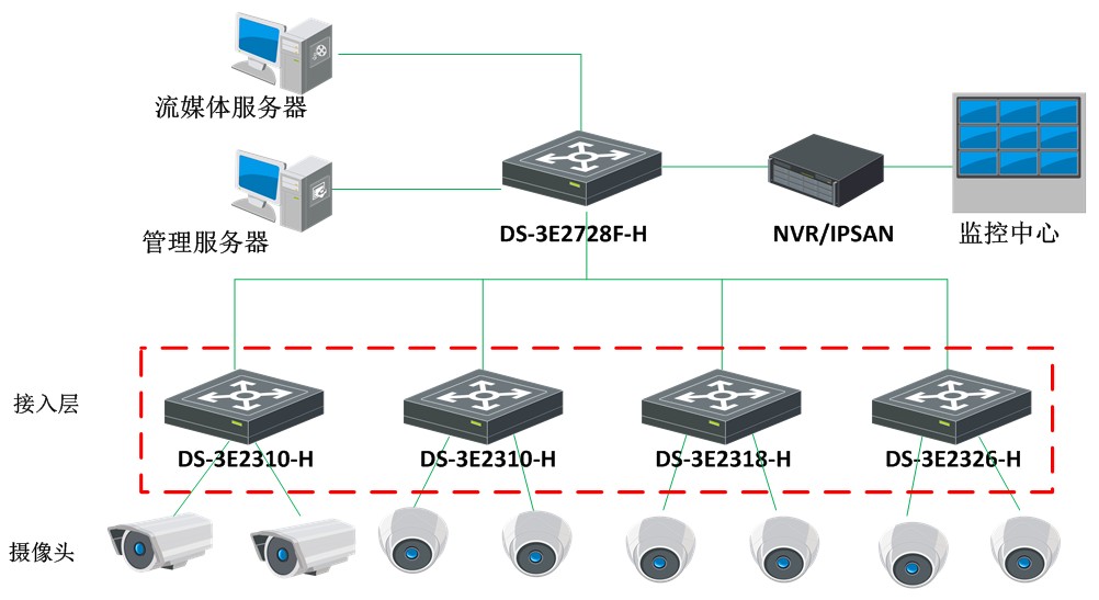 园区、厂房监控网络接入层可选用 DS-3E2300-H系列交换机,DS-3E2300-H 设备具备线速转发、不同端口密度款型的选择能够满足标清、高清监控码流的传输要求,DS-3E2300-H设备功耗低,端口防雷等级高,极大简化了施工部署,提高了可靠性。