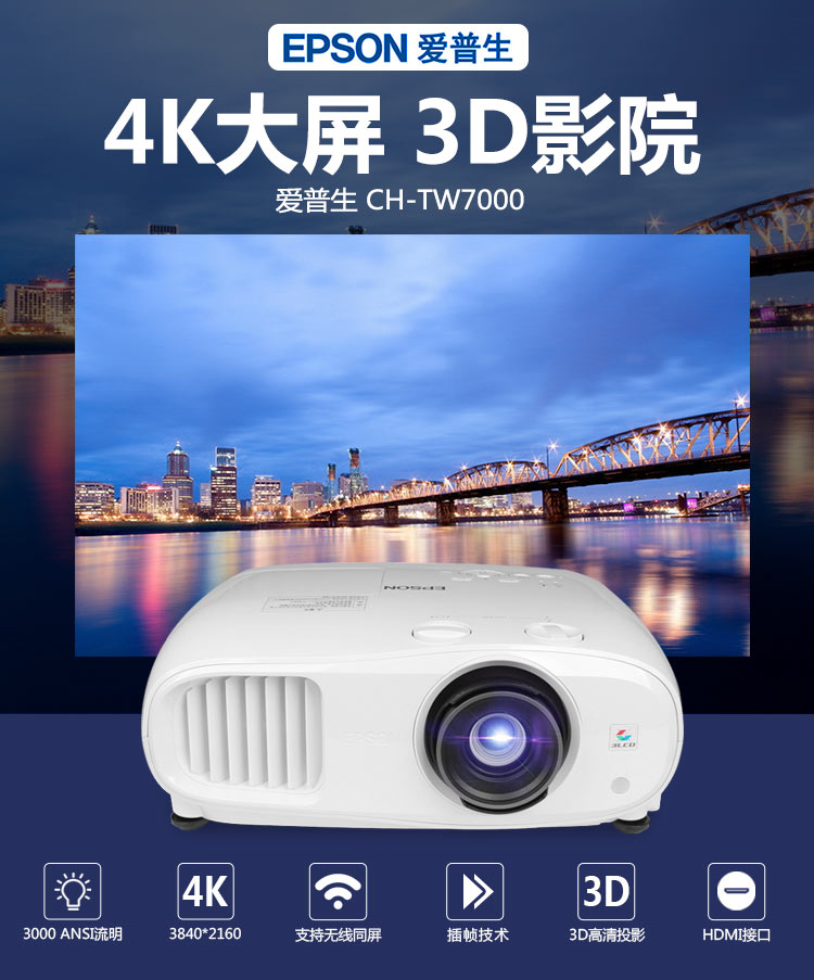 爱普生 CH-TW7000 (TW6300升级版)投影仪 4K 3D超高清投影家用娱乐家庭影院投影机