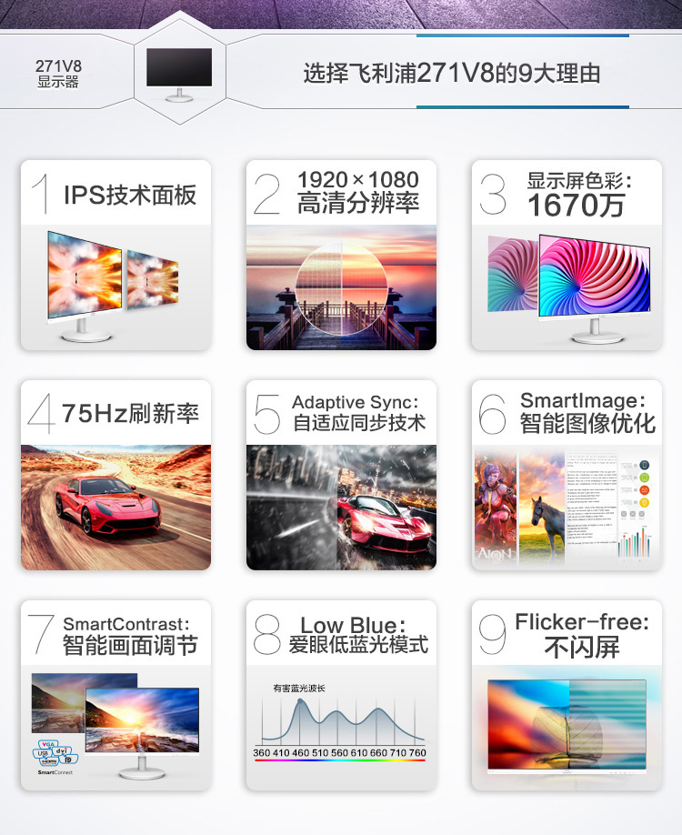 飞利浦 271V8 IPS显示器 27英寸液晶可壁挂 窄边框HDMI(荐)