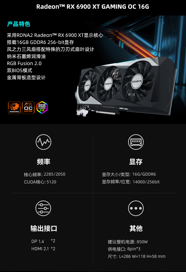 • 技嘉 RX6900XT 16GB AMD 台式电脑独立游戏显卡