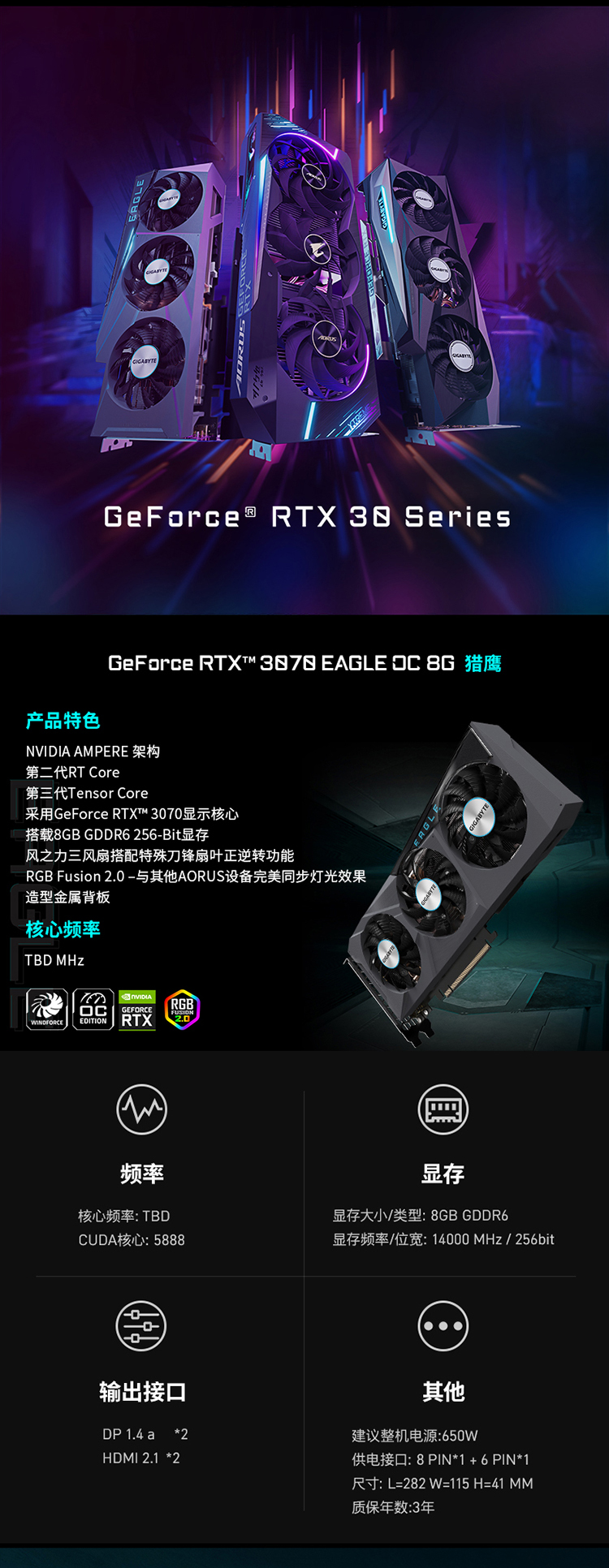 • 技嘉 RTX3070 EAGLE OC 猎鹰 魔音OC/ GAMING OC 8G游戏吃鸡电脑独立显卡3070