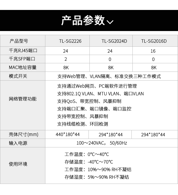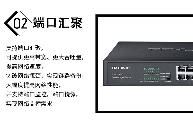 • TP-LINK全新开发推出的2系列Web网管交换机,采用新一代高性能硬件和软件平台,提供灵活、高性价比的全千兆端口,支持灵活的802.1Q VLAN、端口监控、端口汇聚、QoS、带宽控制等常用功能,易于管理维护,适用于校园、酒店及企业园区网络接入应用场景。