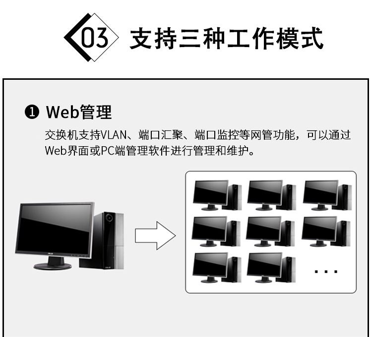 • Web管理模式:交换机支持VLAN、端口汇聚、端口监控等网管功能,可以通过Web界面或PC端管理软件进行管理和维护。
