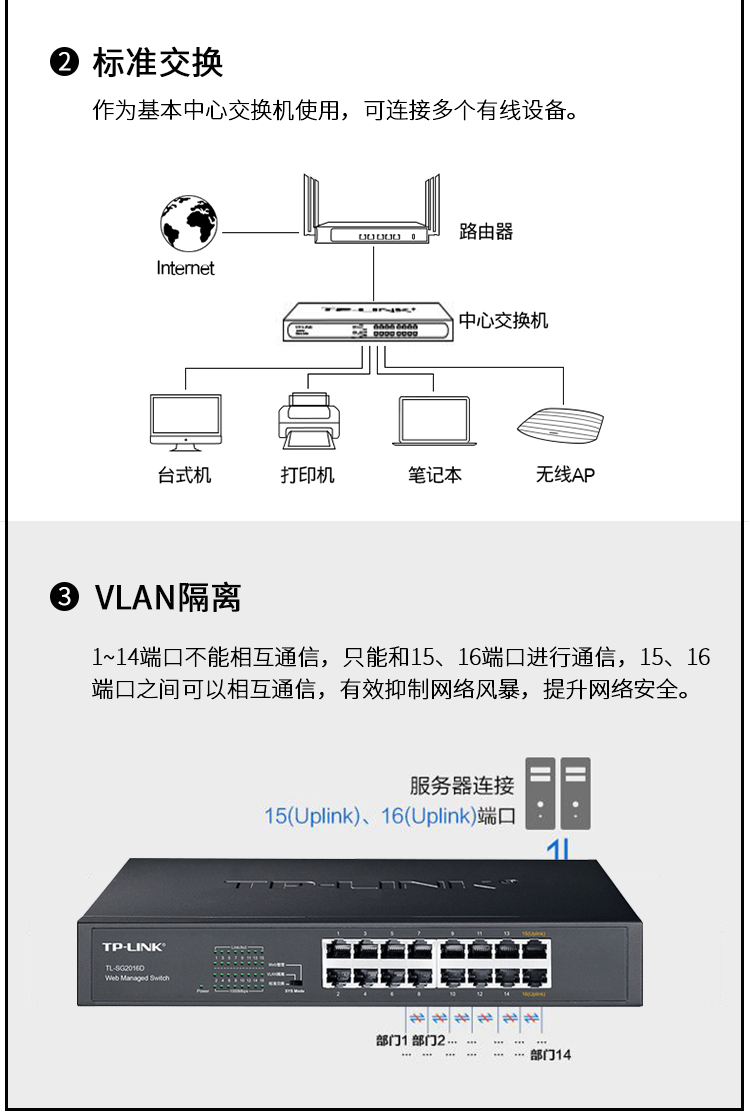 TP-LINK全新开发推出的2系列Web网管交换机,采用新一代高性能硬件和软件平台,提供灵活、高性价比的全千兆端口,支持灵活的802.1Q VLAN、端口监控、端口汇聚、QoS、带宽控制等常用功能,易于管理维护,适用于校园、酒店及企业园区网络接入应用场景。