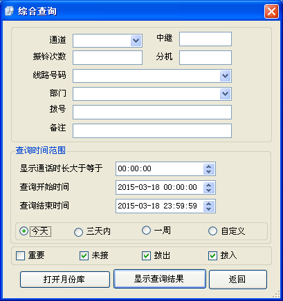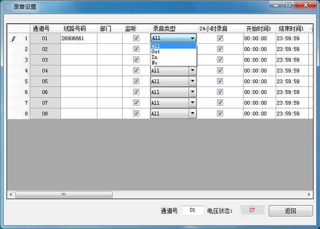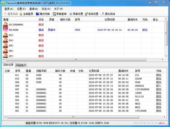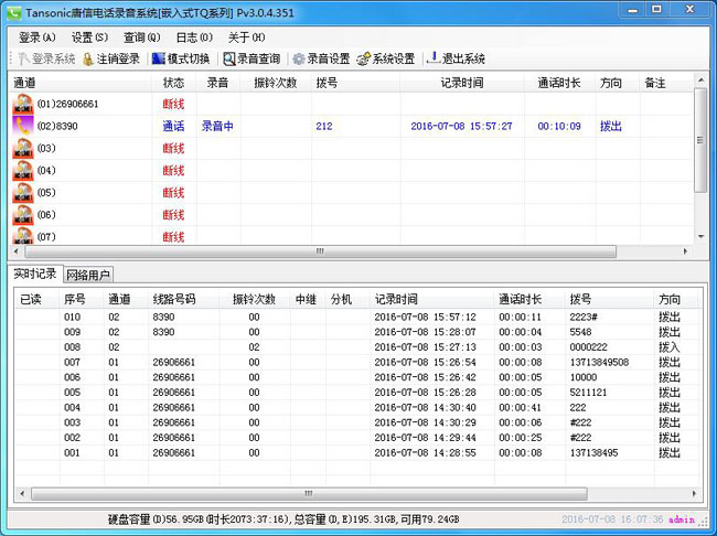 18、线路管理 对线路进行电话号码及使用者姓名注释,管理方便一目了然。也可设置24小时录音或分时间段录音,最大可设置4个时间段。19、特号设置 可设置特殊电话号码,系统将自动作不录音处理。20、通电自启 电源停电再次来电后,无需操作任何开关,系统会自动启动后并进入录音监控状态,保证你不会因为忘记不及时开机而导致录音丢失。21、断线告警 当通道线路断线后,系统自动发邮件告警通知管理人员,让管理人员实时知道线路状态,保证录音有效正常进行。22、快速查询 连接专业的MSSQL数据库使用,缩短在数据量大的情况下,等待结果的时间,提供应用效率。23、分组管理 在服务端可以根据公司不同部门进行分组管理,每个部门经理只能查询自己部门的人员通话记录。24、跨时间段查询 传统的电话录音系统一般只能按照每月范围内进行查询,例如:需要查询2014年5月5日至6月30日的数据,传统的电话录音系统则无法实现,只能按照5月份,6月份2份结果再进行统计,本设备则可以实现跨时间段查询,可以查询任意时段。25、大容量存储 出厂自带1000G硬盘,最少可以保存33250个小时的通话记录.按照16个通道来计算,平均每天每个通道通话2个小时的电话量计算,可以保存约1039天录音数据。系统硬盘如果录满了会自动覆盖最早时期的录音文件。温馨提示:出厂时默认是1000GB的硬盘,用户可以选配2000GB的硬盘。26、智能客户端 为每一个系统配有智能客户端软件,在需要监听的计算机安装后,即可实现实时监听,查询,统计,连线状态等功能。(此版本只支持同时1个智能客户端查询,如果需要多个智能客户端请选购我司另一款T3系列的嵌入式产品。)27、WEB查询端 WEB查询端跨平台查询。比如:苹果电脑、手机、平板上进行查询。