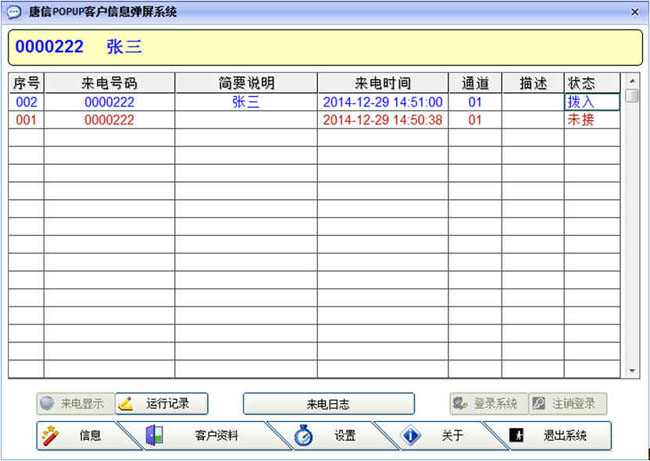产品详细说明: 应用特点: 1、客户服务中心监测服务人员的服务态度,技术水平,考核工作能力,分析产品存在问题,收集客户的意见,为产品改进提供宝贵的依据及电话费用管理。 2、公司决策层,监察企业电话的总体运作,考察企业电话资源与人力资源的利用率,全面考察企业人员的工作能力与业务水平,迅速发现和杜绝损害企业利益行为,电话录音系统可促使职员全心全意,优质高效的工作来赢得企业的认可和获得企业的嘉奖,发现新的业务潜力和新的业务方向,为企业决策人员提供意想不到的法律依据。 3、业务人员及时了解客户状况,提高销售成交率,并可针对性培训业务人员的业务技能。 4、可以为一些特殊场合提供证据,并可把内容直接提取,简单地移到通用播放器直接播放。 5、其他行业提供有效的法律依据。 6、弹出客户详细信息的客户信息管理功能。功能特点: 1、实时录音 当被监听设备使用时,系统便自动进行录音,系统把语音信号以数字化语音格式写入硬盘。同时系统记录其通话日期、时间和当前通话时间等信息。如果该被监听设备为电话线路,还可以记录打出电话的外线号码或打入电话的来电号码,挂机时系统便会自动停止录音。2、实时监听 当被监听设备使用时,系统可以通过有源音响或耳机对任意一路当前通话的通道进行实时监听,监听时不会影响通话人员,也不会影响录音质量。3、来电弹屏 电话打入时,座席电脑屏幕即时弹出来电号码及详细的客户信息。可按联系人、公司名称分组列表显示,方便操作。支持用户权限管理,不同等级不同权限,黑名单,VIP客户电话号码自动提醒,来电信息并可按要求发送到指定通道或座席或工作组。4、来电统计 对所有拨入的电话按来电号码、通道、来电号码、呼叫时间、话务类型、通话时长等进行统计。5、去电统计 对所有拨出的电话按来电号码、通道、来电号码、呼叫时间、话务类型、通话时长等进行统计。6、未接记录 外线呼入后,电话没有接听,该电话则自动进入未接记录栏目。7、分机记录 在使用集团电话(或交换机)的情况下,直接连接外线端口进行录音,可以根据分机号码进行查询统计,此功能必须配合启用唐信计费软件进行使用。8、商务管理 商务管理是针对业务电话进行来电记录、弹出上次通话内容记录、业务流程登记、货款支付方式、详细的地址等。在客户资料库添加了客户资料以后,当该客户来电时可弹出客户详细资料窗口提示。在此,您可以清楚地看到客户的地址,电话,交易记录等内容。让您在第一时间获取了来电人的详细资料,知己知彼,占据了业务的主动性,从而赢得客户,抢占市场,提高企业效益;该系统可成为您商务办公的好帮手。