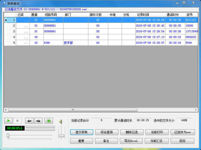 通过客户端软件在网络客户端对录音设备进行录音监听。10、录音查听 可按来电号码或拨出的电话号码、中继、分机、通话时间、时长,自动判断拨出拨入方向、市话还是长途条件进行查听;支持模糊检索;对录音、备份资料进行快速、简洁的回放查听。11、远程管理 系统可以设置自动向远程服务器备份,每个分点电话的录音系统实时通过FTP向指定的服务器进行自动备份,在远程服务器上可以直接进行管理,而不需到每个分点当地端上查听,有利于节省管理成本,提高效率。12、自动备份 对于有些重要的录音数据,可以通过此功能对其进行自动备份,以防止系统在遇到不可预料的故障时,数据可以恢复。系统具有自动同步双备份功能,也可通过系统手工备份到您想要保存的目录或刻录光盘永久保存。13、资料导出 录音数据如有需要则可以使用此功能导出WAV格式,可在任意计算机上使用自带的播放器即可播放。14、权限管理 系统具有多级用户管理功能,不同权限的用户只能操作其相应的功能,例如可以设定某操作员只能查询、统计录音,而不能删除录音数据等。15、多种录音方式 具有压控、键控、声控等多种录音方式选择,每条线路均可设置不同的录音方式或不录音。16、日志管理 系统具有完整的操作日志,可以记录对系统的所有操作。17、循环空间 可以设置多达4个盘(可以是硬盘、分区或网络映射盘)自动循环录音空间,当系统的硬盘空间将满时,系统将自动清除最先录音的文件,确保系统常年不间断运行。