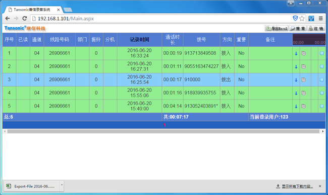 技术参数: ●通道数:16 ●系统平台:WIN 7 ●内存:2GB ●硬盘:1000GB(1GB可以约35个小时) ●客户端数量:1个 ●连接方式:并联 ●录音启动方式:压控、键控、声控 ●最大消耗功率: ≤30W ●工作温度: 5℃-40℃ ●信噪比: 60dB ●湿度: 5%-85% ●频率响应: 300-3400Hz(±3dB) ●数据速率: 16 Kbps、32Kbps、64kbps/1s ●接口方式: RJ11 ●录放音失真度: ≤2% ●主叫号码: FSK、DTMF ●FSK调制方式: 逻辑 0 : 2200Hz±1%,逻辑 1 : 1200Hz±1% ●呼叫监测: 信号音、语音。 ●DTMF码: 0~9、*、#、A、B、C、D ●语音文件: WAV ●压控模式判断电压标准40-120V(振铃) 18-48V(空闲) 5-17V(摘机) 附:产品部分图片: 1、硬件后视图 2、主工作界面,可以直观看到线路的空闲,通话时长等状态。 3、录音模式与分时间段录音设置界面 4、录音模式启动设置方式界面,如“Key”为键控方式,即选择性录音,重要通话时按“*”键才录,不按键则不录音。 4、FTP设置界面,总部可以按网点进行查听,统计各分公司的通话记录。 5、客户信息弹屏功能界面,客户来电后可以直接在计算机看到客户的电话号码,地址,姓名等详细信息。 6、来电时,在屏幕右下角弹出的小对话框。 7、客户资料界面:在这里可以完成对客户资料的编辑,添加,删除,导出,导入等操作,也可以把原有客户资料按指定格式导入客户资料库。 8、录音查询界面:用户可以在这个完成,录音文件的查询,播放,统计通话数量,通话时长,备注,导出等功能,也是录音系统最常用的一个功能模块。 9、“综合查询”界面:可以按姓名,线路号码,部门等指定条件来查找,统计录音记录。 10、打印汇总界面,可按月/天统计话务人员的呼入次数,呼出次数,通话时长等。 11、客户查听端界面,客户端可以在同一局域网内自动获得主机的IP地址然后登录,从而实现查听,播放,统计录音数据等功能。 12、客户端工作界面 13、WEB网页登录访问登录界面(支持跨平台,跨系统进行查询,统计,播放,导出录音文件等操作) 14、WEB网页工作界面